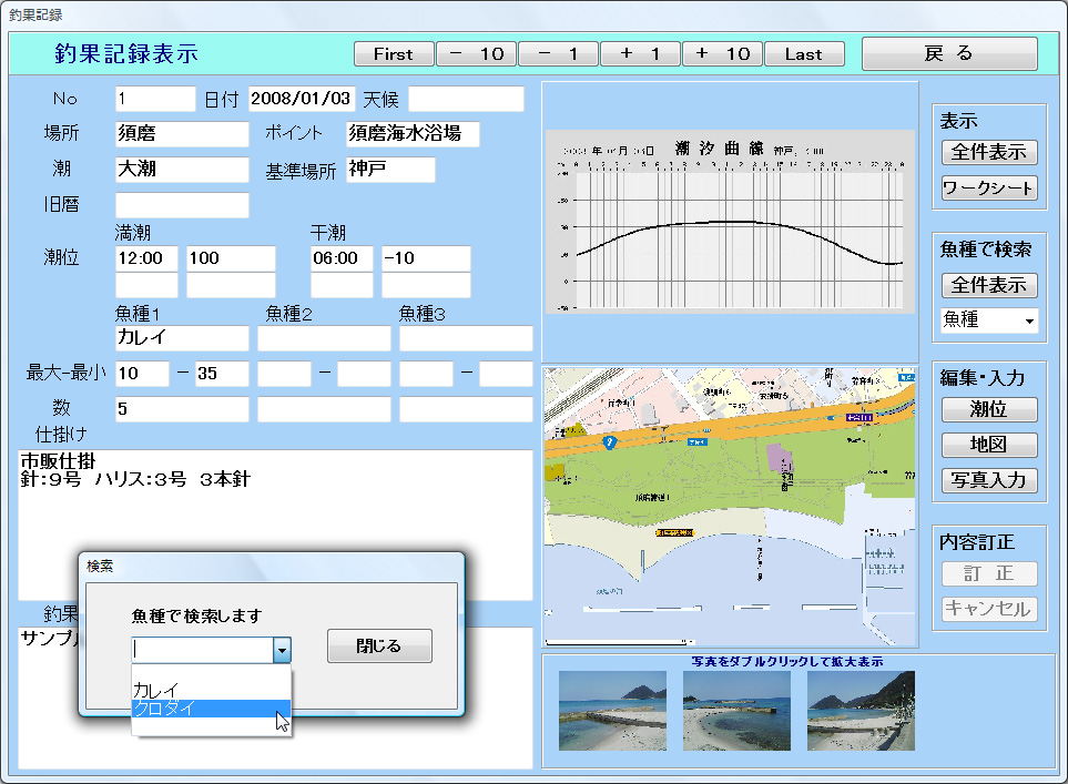 サイズも記録でき、潮位表や釣れたポイントの地図、写真を登録することも可能です。