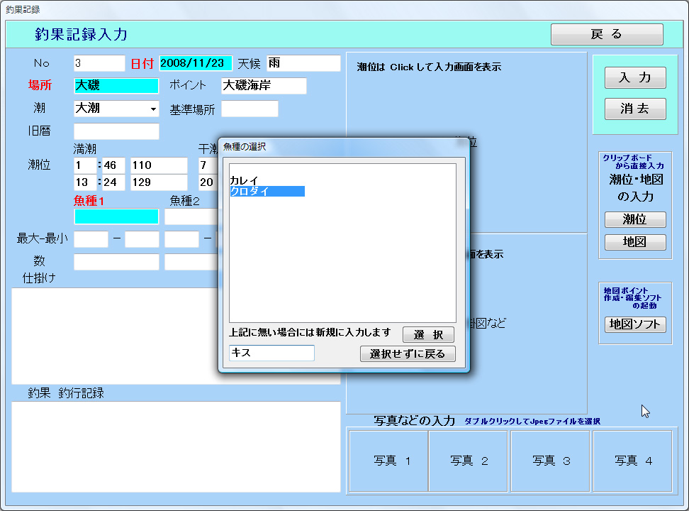 場所やポイント、魚の種類は、各入力欄をクリックすると表示される入力画面の